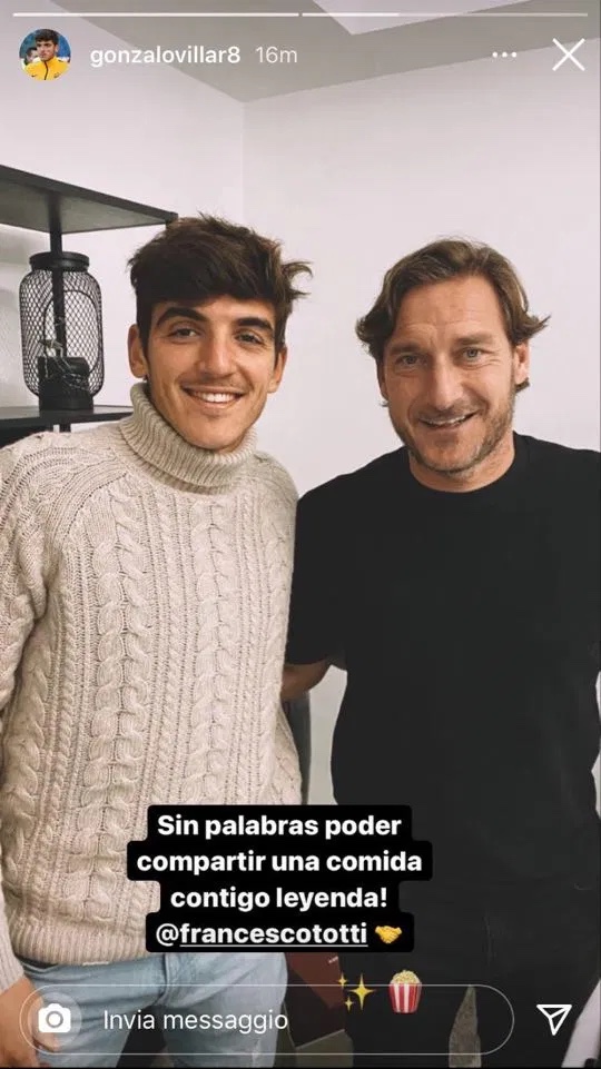 Pues Gonzalo Villar ceno en compañía de un viejo conocido de la Roma. Con un tal Francesco Totti, como reveló el propio ex del Elche con una historia en Instagram. En la foto están el pasado y el futuro de la Roma con un comentario del español: