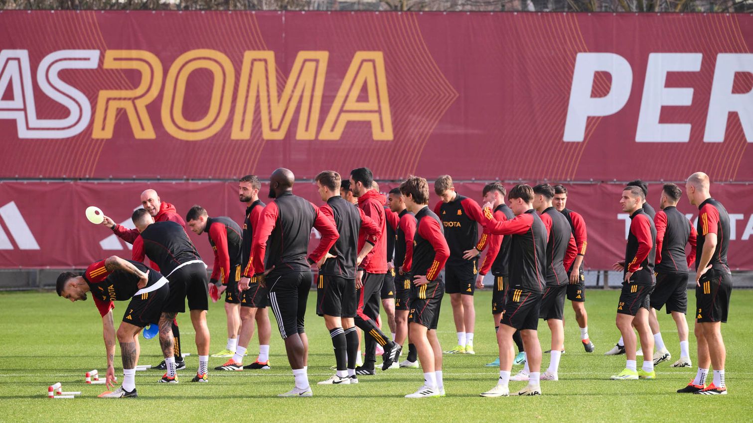 Grupo casi al completo en Trigoria en último entrenamiento previo al viaje a Salerno; Dybala, Mancini y Huijsen a pleno rendimiento