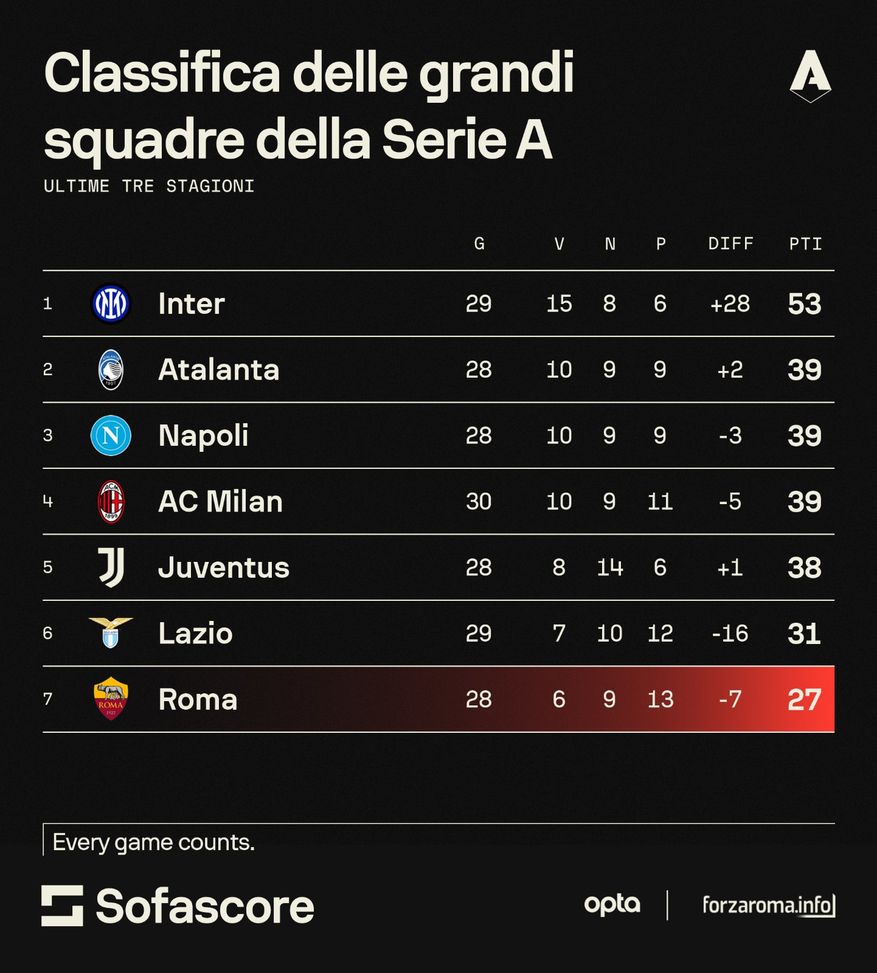 El Inter ocupa el primer puesto con 53 puntos, seguido de la Atalanta con 39, casi todos conseguidos por Gasperini. El Napoli y el Milan comparten los mismos puntos, mientras que la Juventus ocupa el quinto puesto con 38. Este es un problema de larga data que tampoco parece desaparecer este año, aunque cabe mencionar que la Roma al menos ha mantenido la compostura contra el Inter y el Milan en enfrentamientos anteriores. ¿Personalidad? ¿Diferencia de nivel? Quizás ambas cosas, pero sin duda es necesario un cambio de rumbo, a partir del 20 de diciembre, cuando el equipo de Gasperini visite el Juventus Stadium.