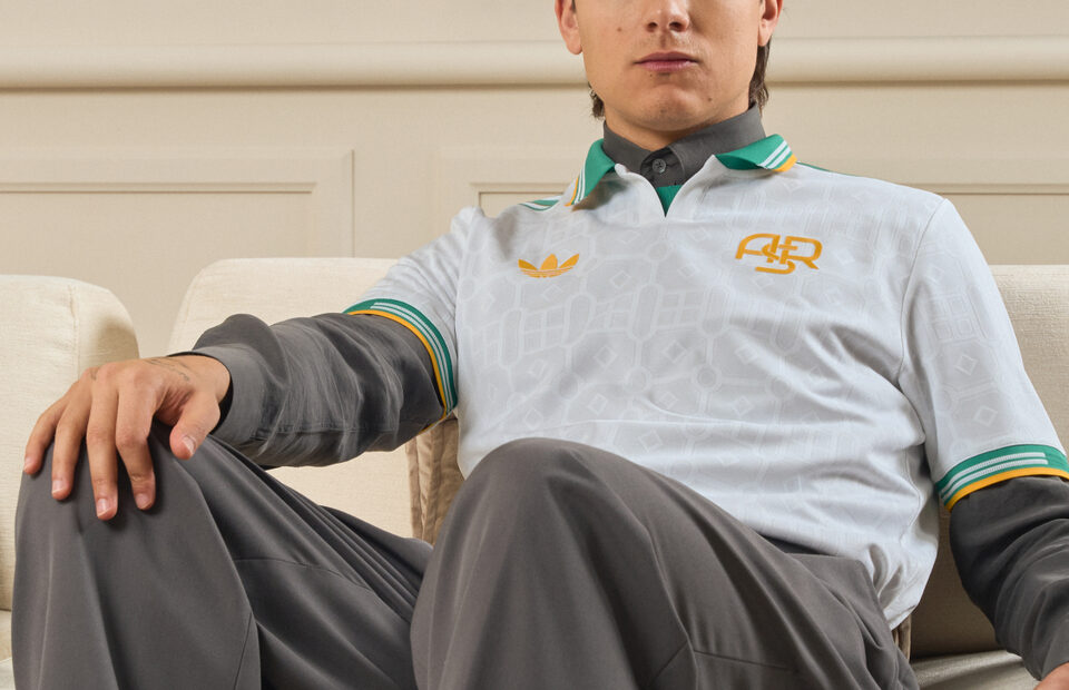 El uniforme presenta un cuello verde y las icónicas tres franjas de adidas sobre los hombros. El logotipo de adidas Originals y el trigram tradicional “ASR”, destacado en un vibrante amarillo sobre fondo blanco, completan un conjunto de fuerte presencia visual. Además, se incorpora un patrón geométrico inspirado en la arquitectura de los jardines italianos clásicos, aportando profundidad y carácter al diseño.