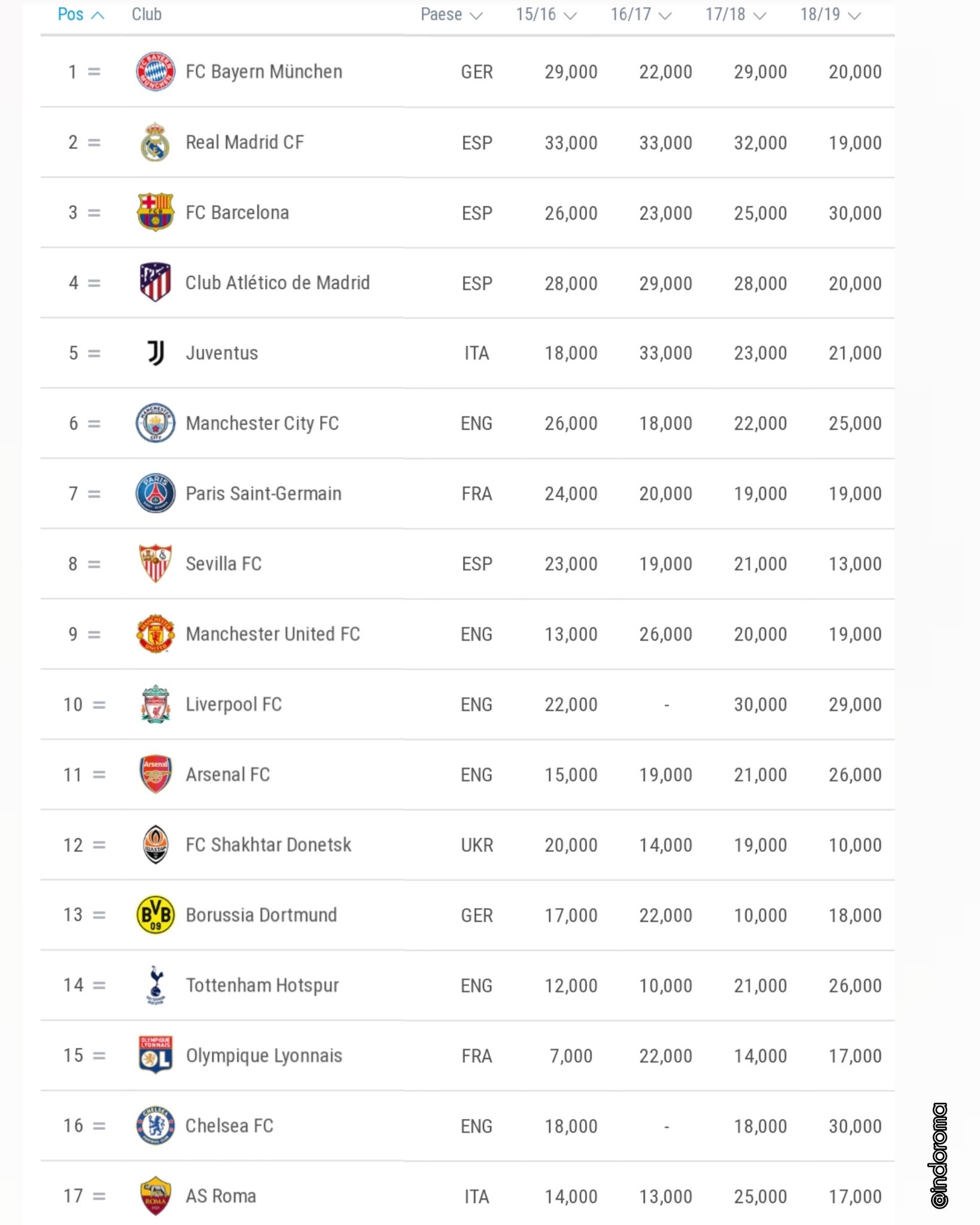 El Bayern de Múnich actual ganador de la Champions League se sitúa en la cabeza de la lista, le siguen en el particular ranking el Real Madrid, Barcelona y Atlético de Madrid. En quinto lugar aprende el primer club italiano, la Juventus, seguida precisamente por la Roma y Napoli, en la decimoctava posición para cerrar el virtual podio tricolor.