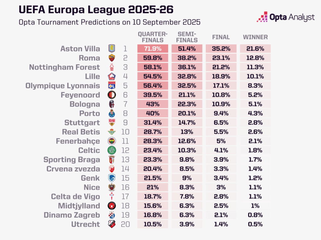 El superordenador de OPTA da al Aston Villa como principal favorito, con la Roma como segundo gran aspirante