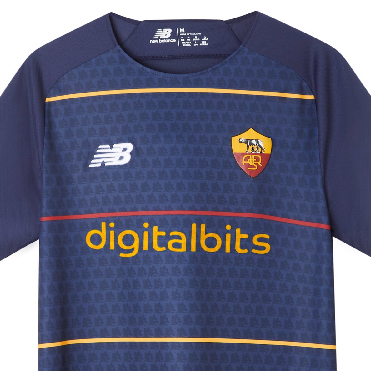 El otro detalle que no pasa desapercibido en la nueva camiseta son las numerosas ‘miniaturas’ del Lupetto de Gratton como textura de la nueva camiseta. El diseño de toda la equipación es azul oscuro, acompañado de franjas horizontales amarillas y rojas, detalles acanalados amarillos. La camiseta tiene cuello redondo y, en la parte posterior del cuello, destaca la inscripción ASR sobre un fondo amarillo y rojo.
