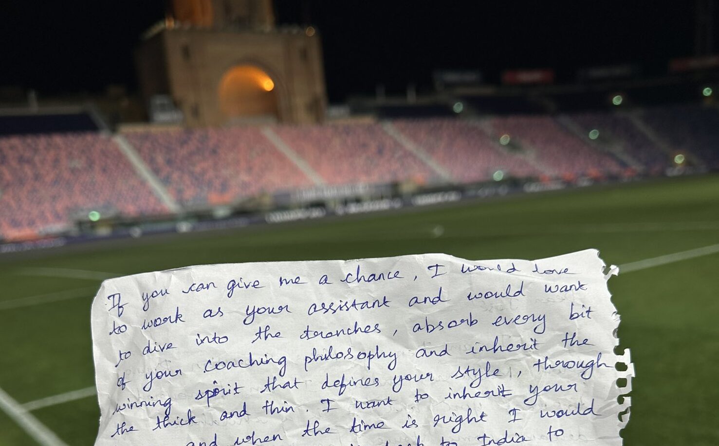 Si me dieran una oportunidad, me encantaría trabajar como su asistente y me gustaría sumergirme en los tramos, absorber cada migaja de su filosofía de entrenador y heredar el deporte ganador que define su estilo, para bien o para mal. Quiero heredar tus enseñanzas y, cuando llegue el momento, me gustaría traer la pasión de regreso a la India para elevar la cultura del fútbol allí. Tu presencia siempre me ha guiado e influenciado. Sentí un fuerte impacto y siento que su guía mejoraría significativamente mi vida. Gracias una vez más por todo y espero tener la oportunidad de aprender de usted”.