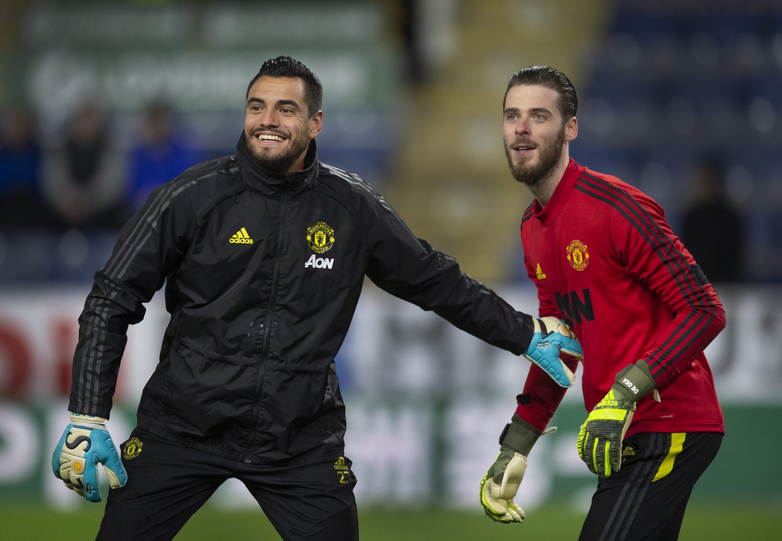 BURNLEY, ENGLAND - DECEMBER 28: Manchester United goalkeepers Sergio Romero and David de Gea warm up before the Premier League match between Burnley FC and Manchester United at Turf Moor on December 28, 2019 in Burnley, United Kingdom. (Photo by Visionhaus) *** Local Caption *** Sergio Romero; David de Gea