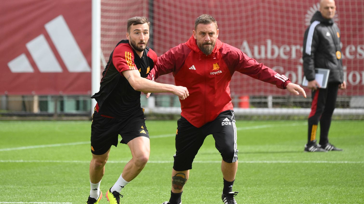 En la sesión de fotos que tuvo lugar este viernes en Trigoria, la sonrisa más divertida fue la de De Rossi. De repente se encontró con traje y corbata, impecable, entre sus muchachos, cuando un momento antes estaba en chándal con Cristante, mostrándole algunos movimientos para distanciarse en medio del campo.