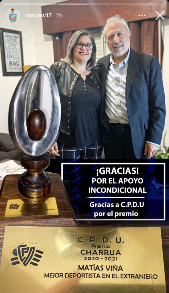 Matías Viña recibe una grata alegría. Y es que el lateral de la Roma fue elegido mejor deportista uruguayo en el exterior, premio que otorga la Asociación de Periodistas Deportivos de la nación suramericana. El propio defensor charrúa lo anunció mediante una historia en su cuenta oficial de Instagram, dicho galardón fue recogido por su familia tras el encontrarse en Italia.