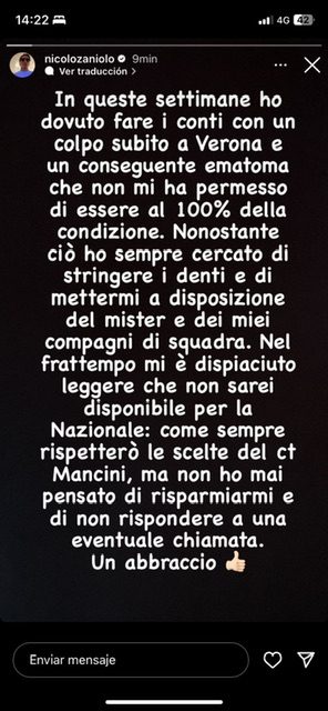Nicolò Zaniolo rompe el silencio en redes sociales. El atacante clase del ’99 a través de su perfil oficial de Instagram, quiso enviar un mensaje claro a la selección italiana y a Roberto Mancini: “En las últimas semanas tuve que lidiar con un golpe sufrido en Verona y un consecuente hematoma que no me ha permitido estar al 100% de la condición”.